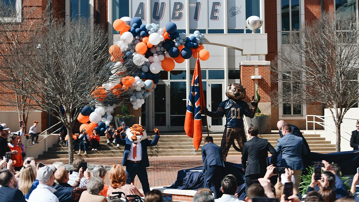 The 6-foot-2-inch figure shows Aubie holding an Auburn flag, a nod to his commitment as a spirit leader and his gameday tradition of leading the team onto Pat Dye Field. Artist Alison Brown Caswell consulted on the design and was commissioned to cast the figure. The Oregon-based sculptor is known for creating bronze sculptures of mascots for the University of Oregon, Oregon State University, the University of Southern California and Boise State University, as well as the Buc-ee’s beaver mascot and NBA star and ESPN analyst Bill Walton.